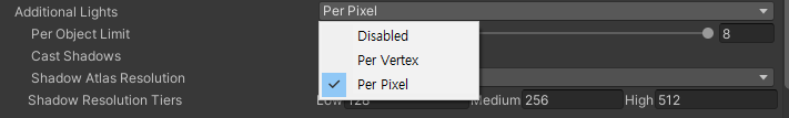 Additional Lights를 Per Pixel로 하면 예뻐지지만 그만큼 Pixel 연산이 들어가기 때문에 성능은 떨어짐