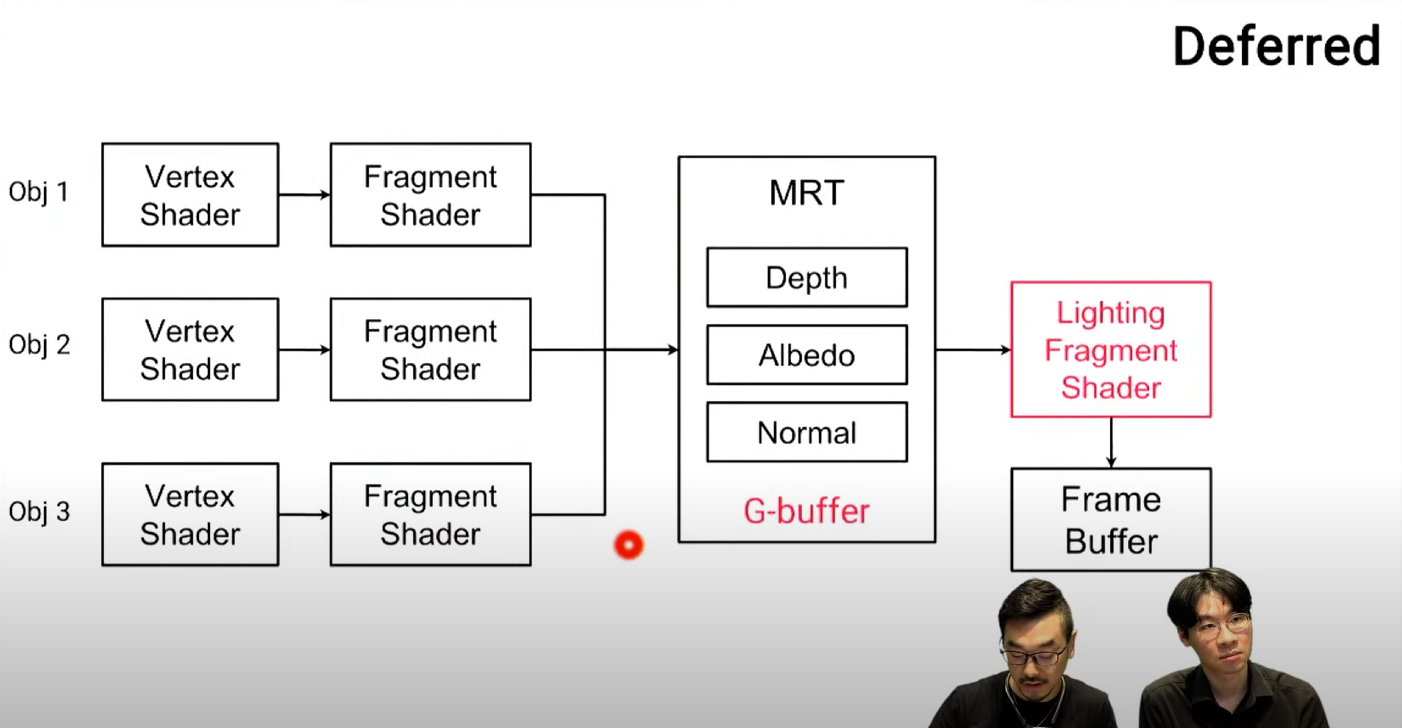 Deferred는 G Buffer에 저장해두고 라이트는 Screen Space에서 나중에 처리 - 오브젝트나 빛의 개수에 종속되지 않음